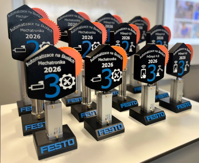 Naši žáci postoupili z korespondenčního kola, kterého se zúčastnilo několik desítek škol, do finále soutěže Automatizace na školách. To se konalo v Praze ve čtvrtek 8.1.2026 v prostorách firmy Festo, s.r.o. a utkalo se v něm pět týmů v oboru mechatronika a tři týmy v oboru průmysl 4.0. Týmy byly dvoučlenné a my jsme měli v obou oborech své zástupce. Jak už nadpis prozrazuje, zaznamenali obrovský úspěch, když Jakub Řezníček s Tomášem Slavíkem v mechatronice zvítězili a Radek Šťastný s Petrem Hegrem skončili druzí.